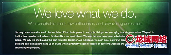 网站建设“关于页面”中,可以通过整个板块居中显示网站主标题的方式,介绍公司简介的内容,对板块进行放大且居中是个很好的布局方式。